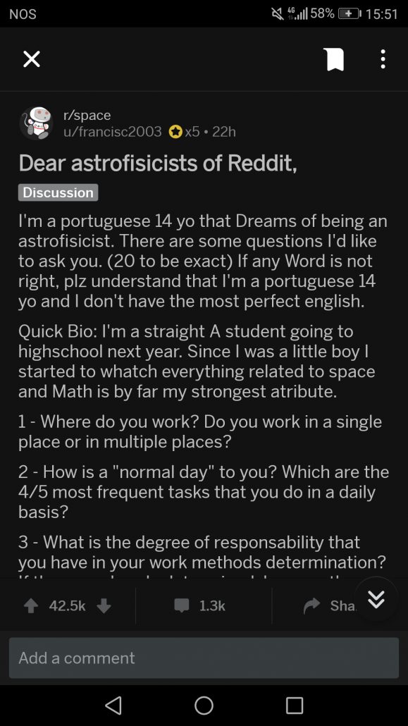 Tem 14 anos, sonha ser astrofísico e fez 20 perguntas no Reddit